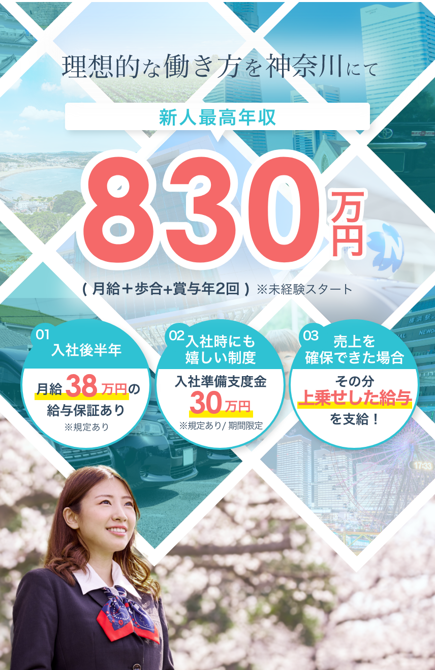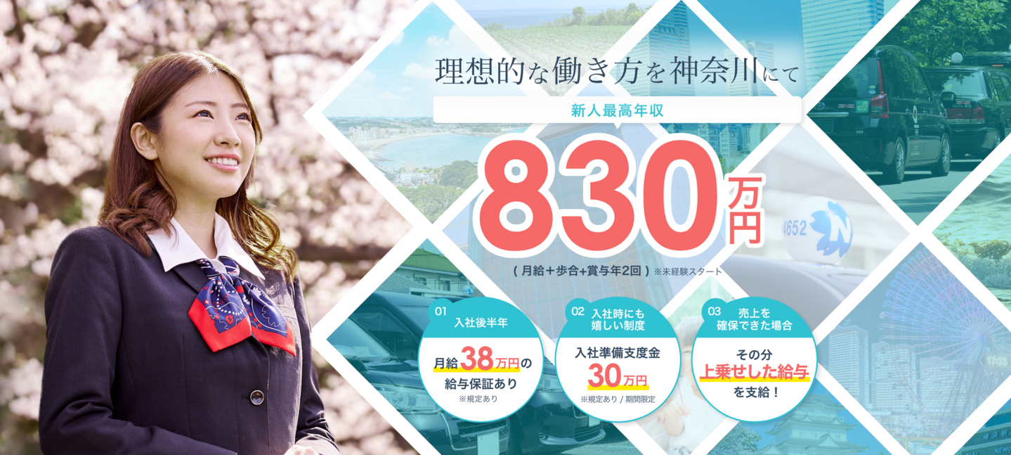 | 給与 | 月給+歩合給 月給:26万円~38万円 6ヶ月間 月給38万円保証+歩合給+賞与年2回(川崎/保土ヶ谷/戸塚本社) ◆保証額を超える売上時は上乗せした給与支給 ※大和:月給26万円+歩合給 ◆配属後7ヶ月目以降 月給18万600円+歩合給 ※小田原:月給195,216円+歩合(試用期間3~6ヶ月間 同条件) ※平塚:月給195,216円+歩合(試用期間3~6ヶ月間 同条件) ※乗務前の教習期間中(最長3ヶ月)は日給1万円 【賞与】 年2回(小田原営業所のみ年3回) 【年収例】 600万円/入社6年目/元営業(月給18万円+歩合+賞与年2回) 500万円/入社3年目/元人事(月給18万円+歩合+賞与年2回) 450万円/入社1年目/元SE(6ヶ月間月給38万円保証+歩合+賞与年2回) |