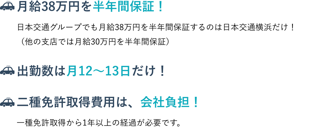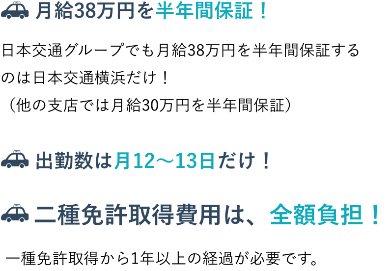 日本交通横浜では、出勤回数が12〜13回のみ。加えて、6ヶ月間は月給38万円を保証します。